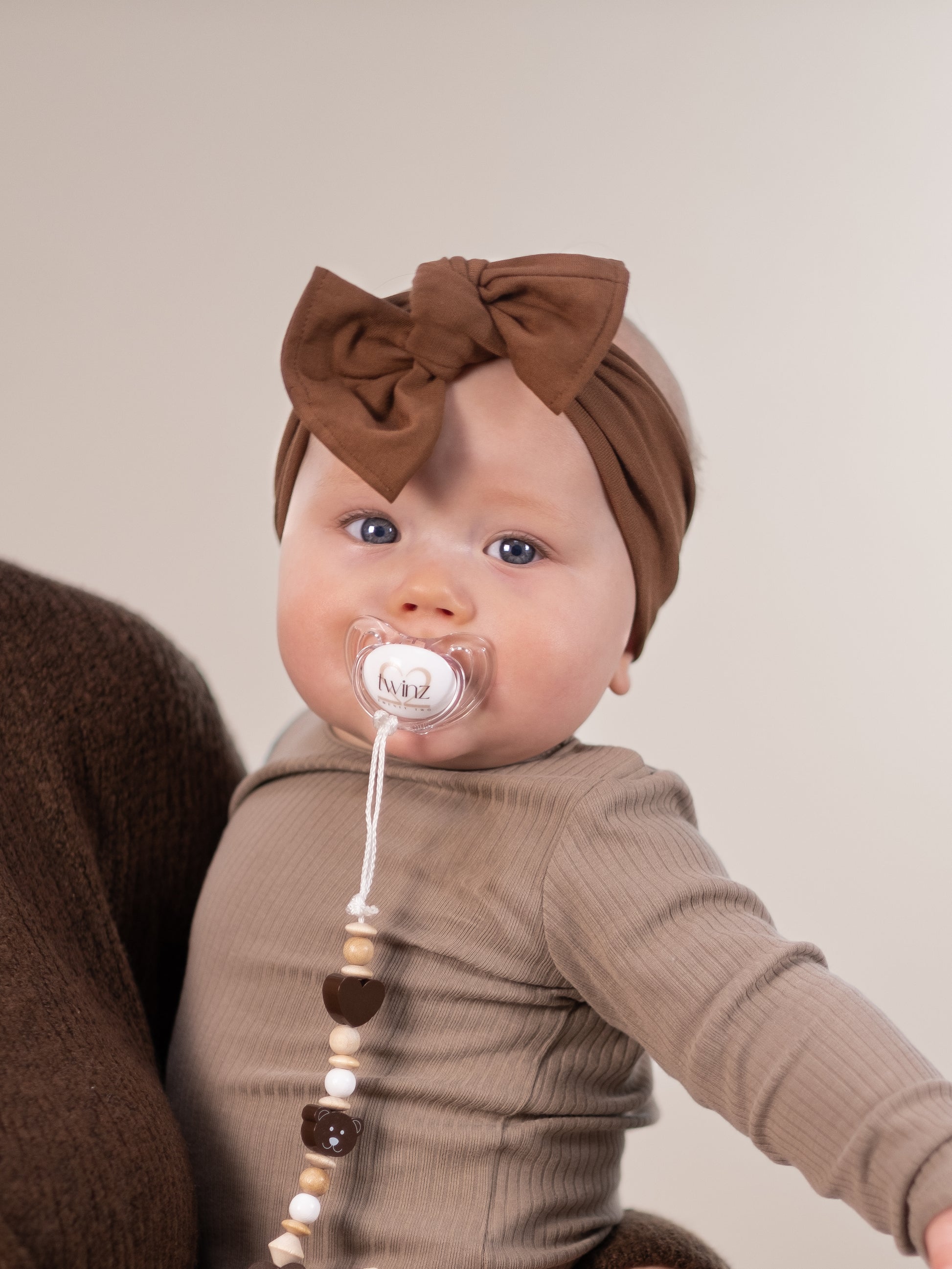 This is the perfect little bow headband for your baby! Our headbands are handmade by moms with high-quality jersey fabric consisting of 95% cotton and 5% spandex for stretch. The brown headband is a great seasonal and classic color for your baby.